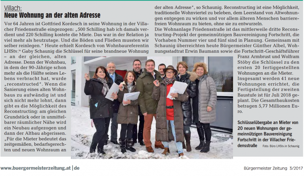 Die beiden FORTSCHRITT Geschäftsführer Dir. Ing. Franz Armbrust und Dir. Wolfram Stöby übergaben in Villach, in der Friedensstraße, die ersten 20 Wohnungen. Insgesamt werden 41 hochwertige Wohnungen errichtet. Bgm. Günther Albel und Wohnbaureferentin – LHStv. Gaby Schaunig gratulierten den glücklichen Mietern.