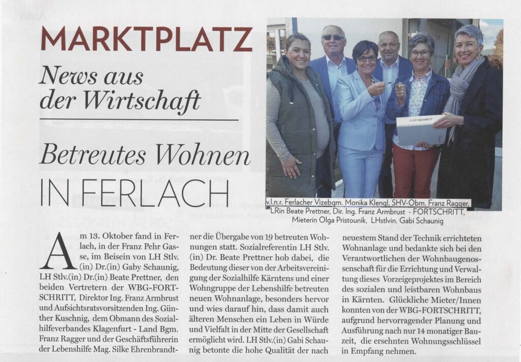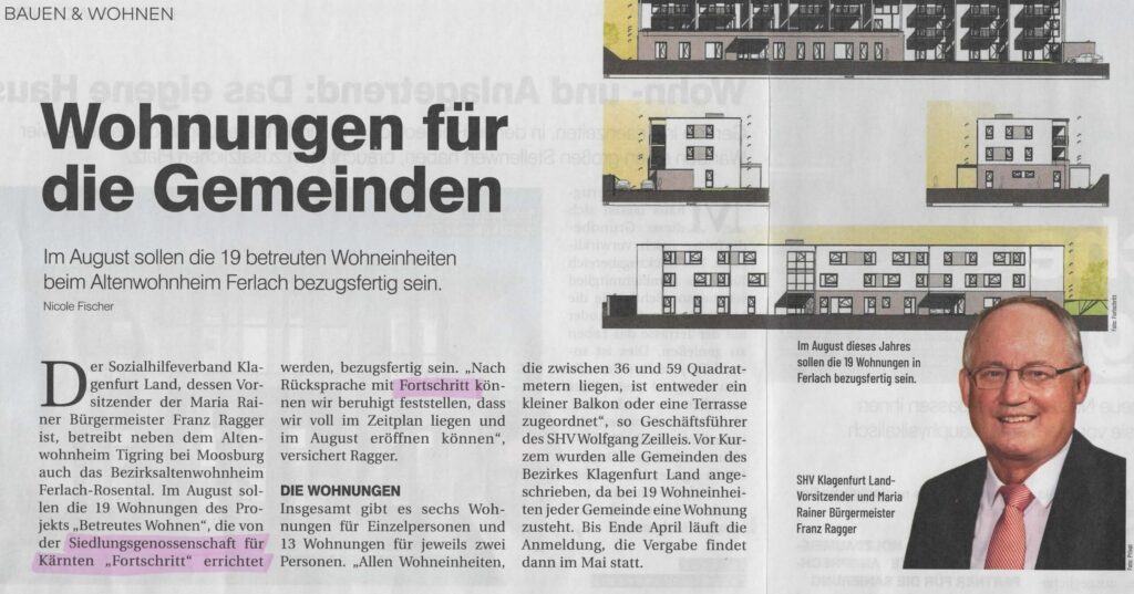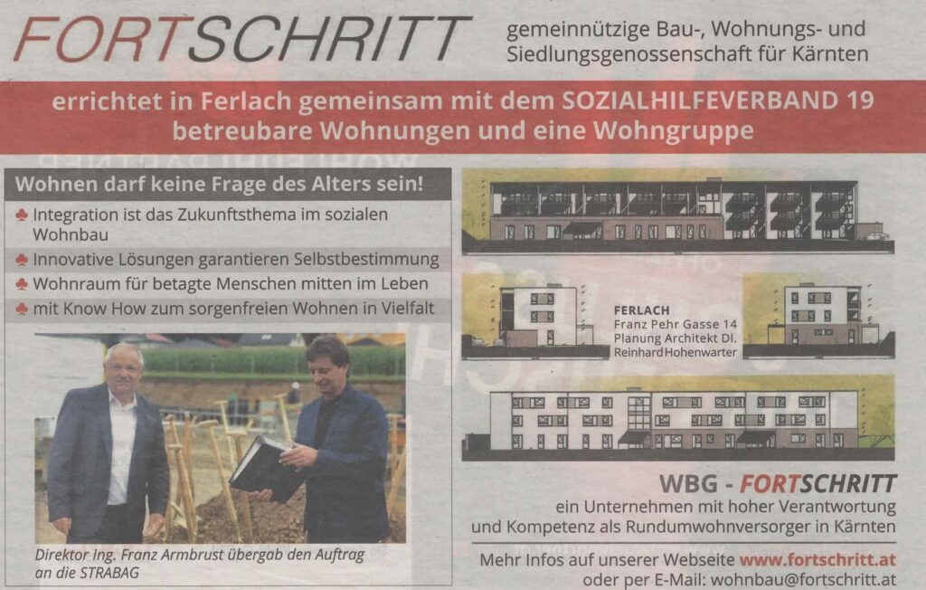 betreutes Wohnung in FerlachVon red-fortschritt / 13. Oktober 2021 Spatenstichfeier in Ferlach am 3.8.2021 in Beisein von LHstv. Gabi Schaunig, LR Beate Prettner, Bürgermeister Ingo Appe und der beiden Direktoren der WBG – FORTSCHRITT und weiteren offiziellen Vertretern